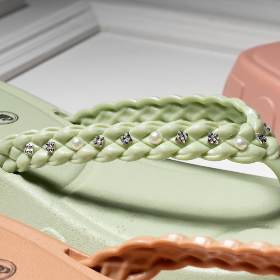 دلّعي رجلك مع PearlWave Slides المصنوعة بالكامل من خامة EVA المستورد عالية الجودة، بتصميم أنثوي عصري، خفيف وعملي، وفي نفس الوقت أنيق بلمسة لؤلؤ وكريستالات تضيف لمسة فخمة لأي لوك.